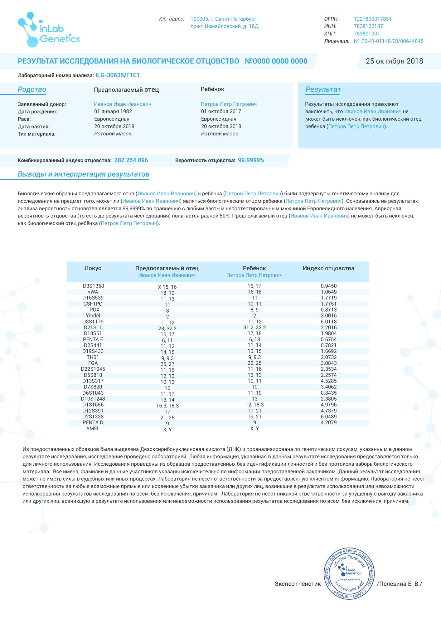 Лаборатория имеет полную аккредитацию и сертификацию. Наши заключения являются полными и развернутыми. Генетическая экспертиза ДНК становится основным доказательством в судебных спорах и принимаются всеми судами и государственными учреждениями Российской Федерации.