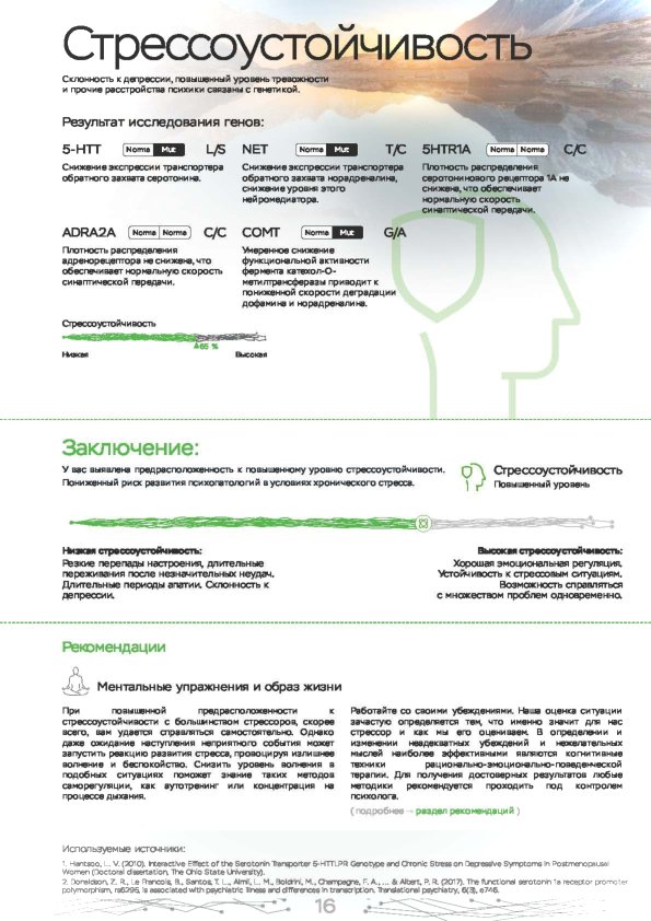 Этот ДНК анализ показывает влияние наиболее важных 10 генов на психическое и эмоциональное состояние. Именно они регулируют выработку гормонов, работу нейромедиаторов. Используйте знания о природных свойствах своего организма для борьбы со стрессом, повышения работоспособности и общего тонуса. Каждый человек индивидуален, поэтому мы рекомендуем пройти наш генетический нейро тест в Новосиле.